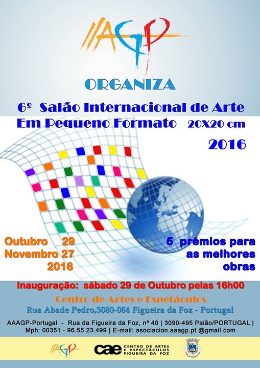 O VI Salão Internacional de Arte em Pequeno Formato 20x20, organizada pela AAAGP - Associação da Amizade e das Artes Galego Portuguesa, vai decorrer de 29 de outubro a 27 de novembro na Sala Zé Penicheiro do Centro de Artes e Espectáculos.